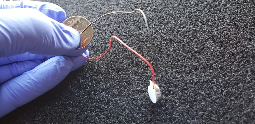 An easy first experiment would be to test the motors to get a feeling for the sort of what to expect. The easiest way to do that is with a battery. A 3V coin cell battery (2032) works well.