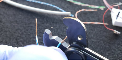 The key to good crimps is getting the right length of exposed wire. I use the flat on my stripper as a rough guide for length — we are shooting for about 2.5-3mm.