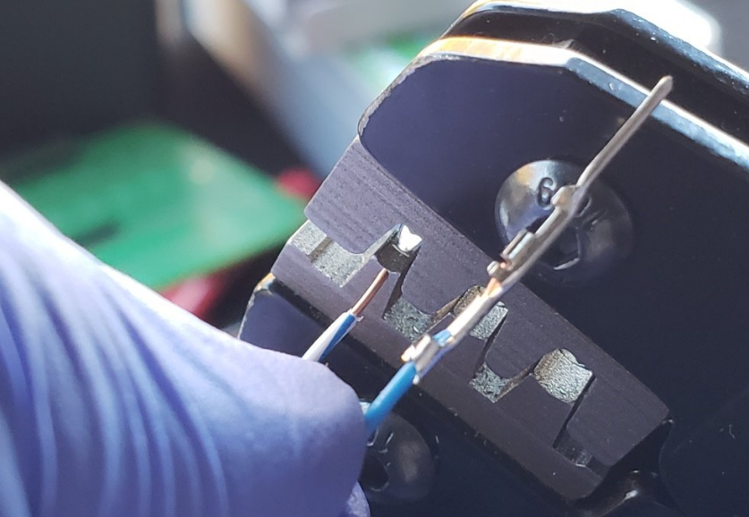 Note the orientation of the pin housing with respect to the pin. Also, notice how the wire in the pins stops before the “locking block” that holds the pin in the pin housing. BTW, this is a female pin; the above photos were with male pins.